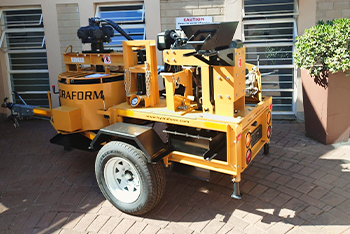 M7M1 Super Interlocking Blockmaking Machine: This model includes a compression chamber, diesel engine, and pan mixer, all mounted on a robust trailer for easy transport.